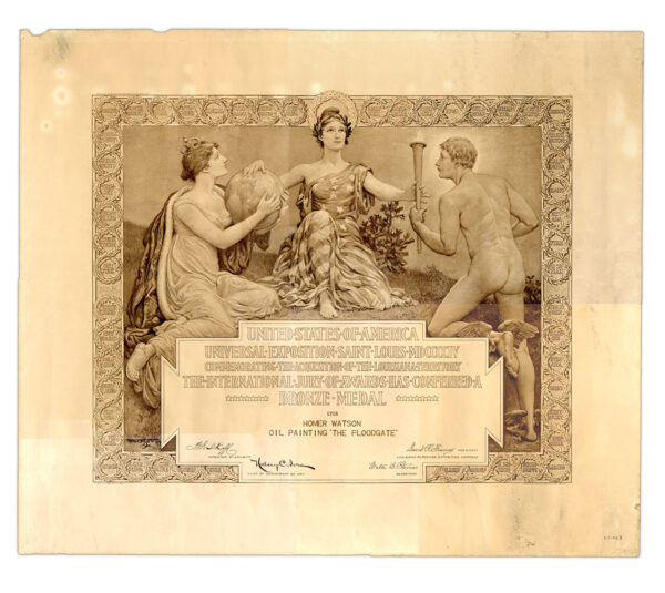 The second award in the gallery’s collection is a 1904 bronze certificate from the Louisiana Purchase exhibition in St. Louis, Missouri. The certificate is for The Flood Gate, which is considered by many to be one of Watson’s best paintings. It is currently a part of the National Gallery of Canada’s collection. Like in the prior London exhibition there were other Canadian artworks present, this time including a piece by Scottish-born painter WIlliam Cruikshank. Cruikshank was Phoebe Watson’s art teacher in Toronto for a time in the mid-1880s.