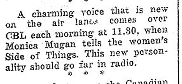 Before the television made its way into North American homes, radio changed the ways that Canadians consumed news and entertainment. Radio was a widespread “craze”, and consequently, the Watson family was no stranger to its draw. In several excerpts from her diary, Phoebe Watson, mentions a few of the programs she tuned in to. One of these programs was Monica Mugan, a self-titled morning show that featured interviews and talks on various subjects.