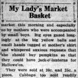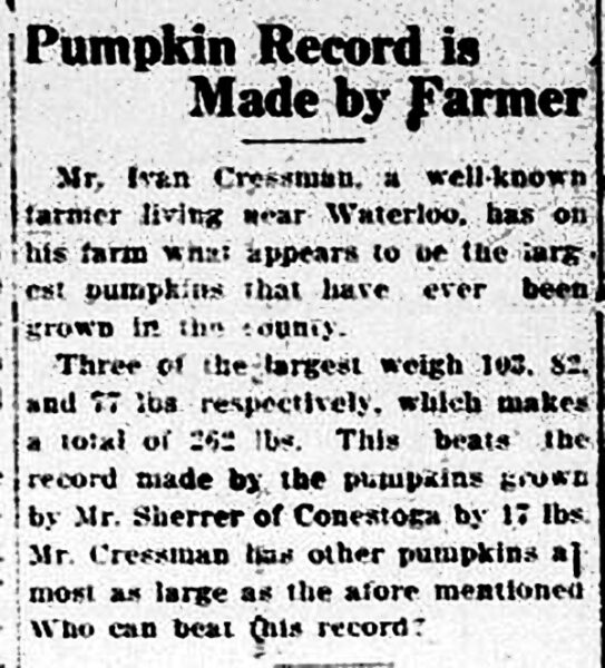 Pumpkins as ornamentation also meant their appearance at Halloween parties. This news article describes “witches, black cats, and pumpkins being used to decorate the Community Hall” in Hespeler.